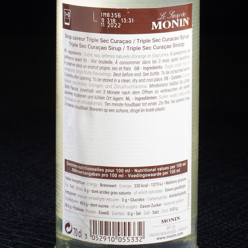 Le Sirop Curaçao Triple Sec 70cl Monin apporte une saveur délicate et fruitée d’agrumes, typique du célèbre curaçao triple sec. Parfait pour donner une touche exotique à vos cocktails, mocktails, et boissons sans alcool, il est idéal pour enrichir vos créations avec des arômes frais et vivifiants.