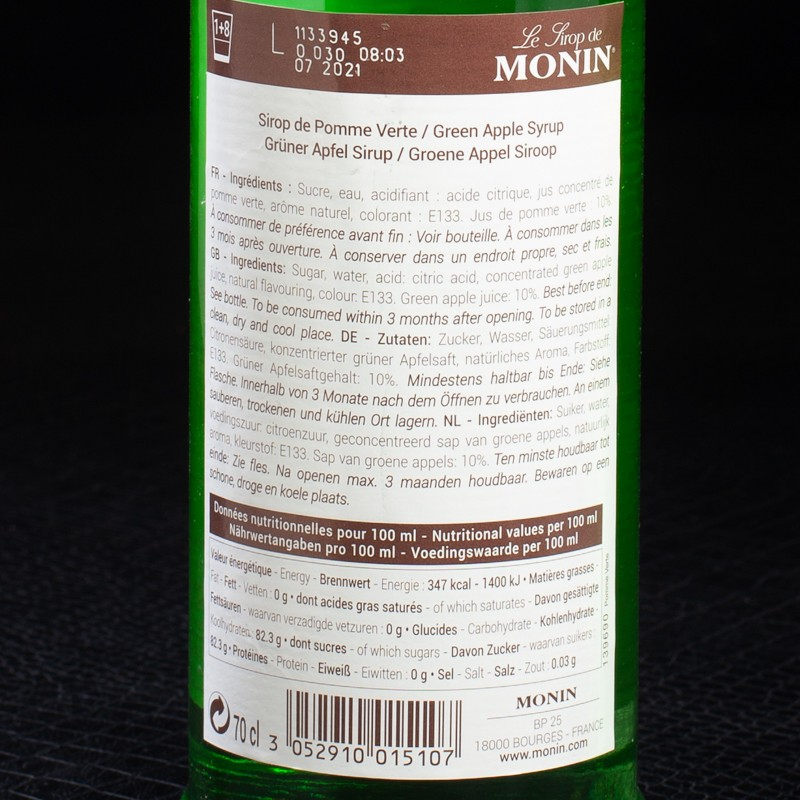 Le Sirop Pomme Verte 70cl Monin vous offre une saveur fraîche et fruitée de pomme verte, parfaite pour ajouter une touche sucrée et légèrement acidulée à vos cocktails, mocktails, limonades et desserts. Ce sirop est idéal pour ceux qui aiment les saveurs fruitées et rafraîchissantes, apportant une belle couleur et un goût délicat à chaque boisson ou recette.