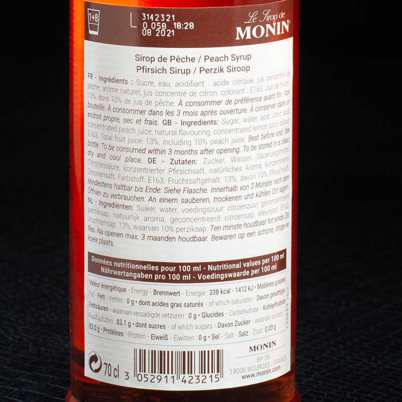 Avec sa couleur dorée et son goût sucré et juteux, le sirop pêche Monin évoque la douceur d’une pêche bien mûre, idéale pour une expérience fruitée et rafraîchissante.