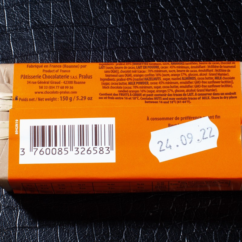 Le chocolat noir de qualité supérieure enveloppe ce praliné aux saveurs fruitées et légèrement acidulées, offrant un contraste entre l’amertume du chocolat et la douceur de l’orange confite. Chaque bouchée est un voyage sensoriel, alliant texture croquante et arômes puissants.